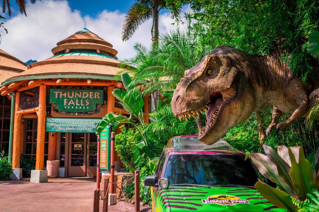 Recorrer el parque abre el apetito, y Jurassic Park cuenta con opciones gastronómicas bien ambientadas. Thunder Falls Terrace es el restaurante más famoso del área, con platos abundantes como costillas, pollo asado y menús ideales para compartir.
